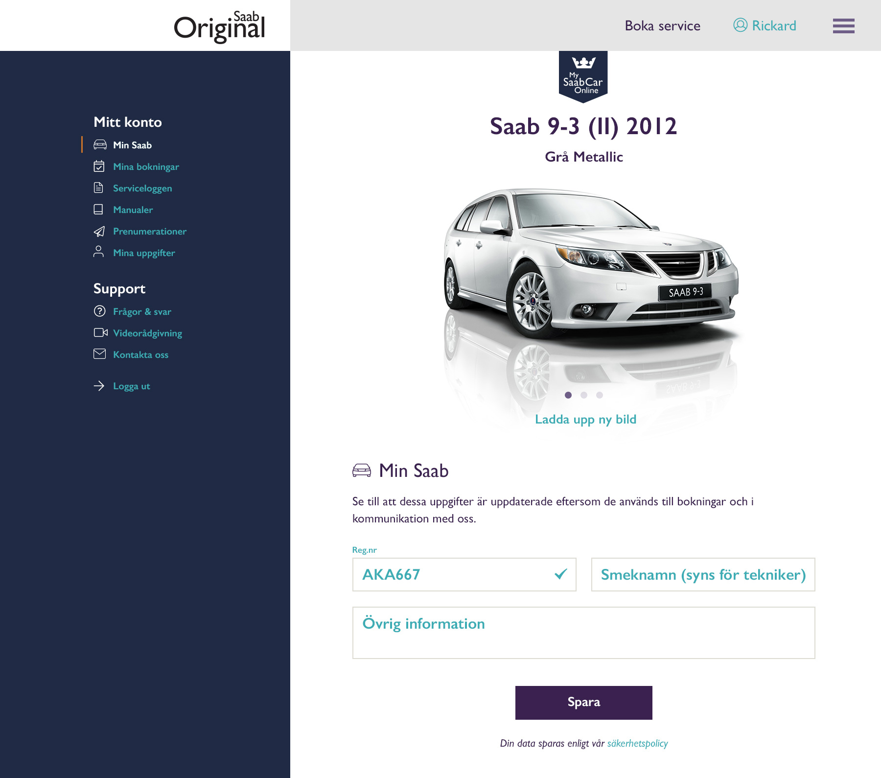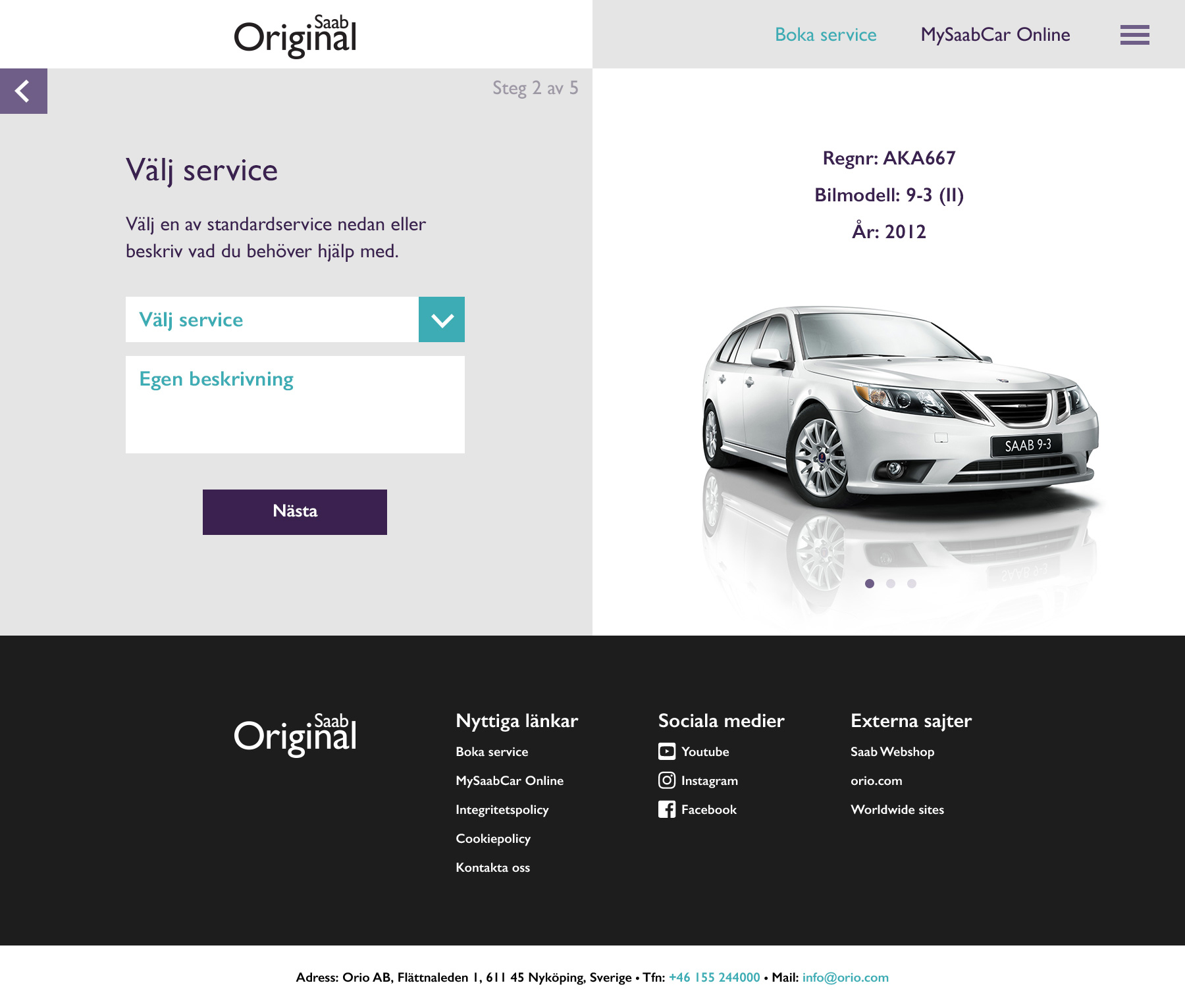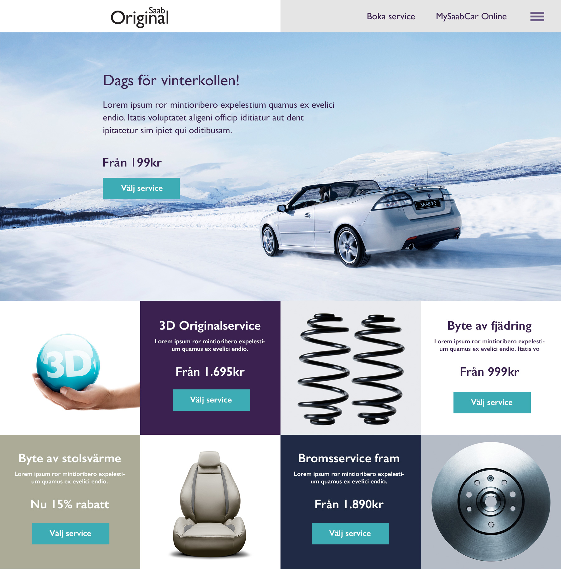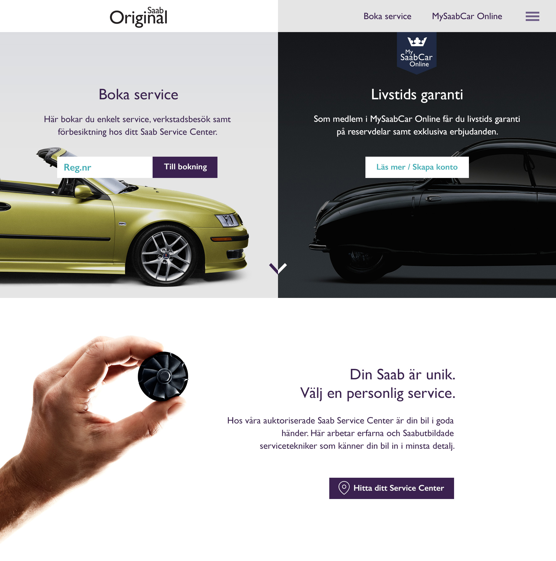 Saabparts.com riktar sig till Saabägare som vill boka service hos en auktoriserad Saabverkstad eller få inspiration. Användaren kan även logga in för att se fordonsinfo, historik, personliga erbjudanden etc. Designen följer Saabs grafiska riktlinjer med vilka jag tog fram den nya logotypen för MySaabCar Online.