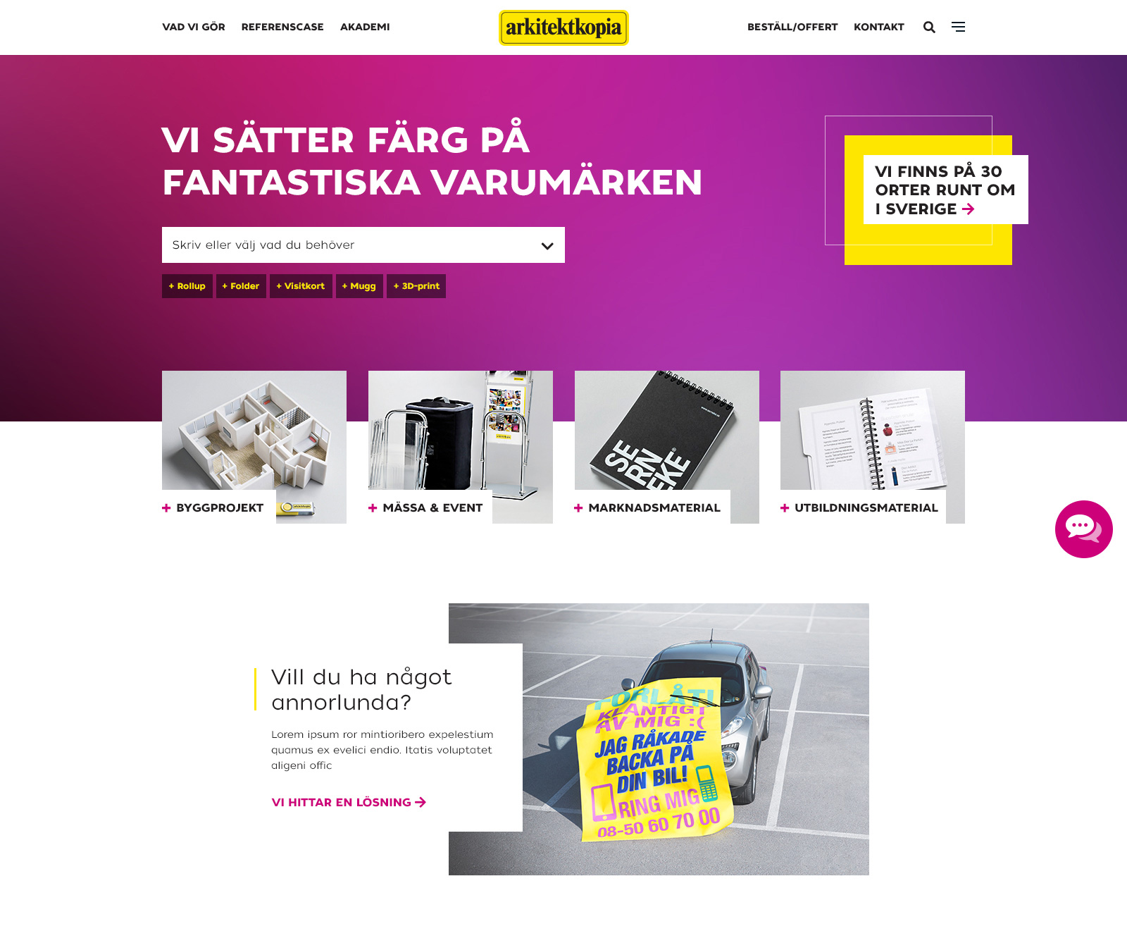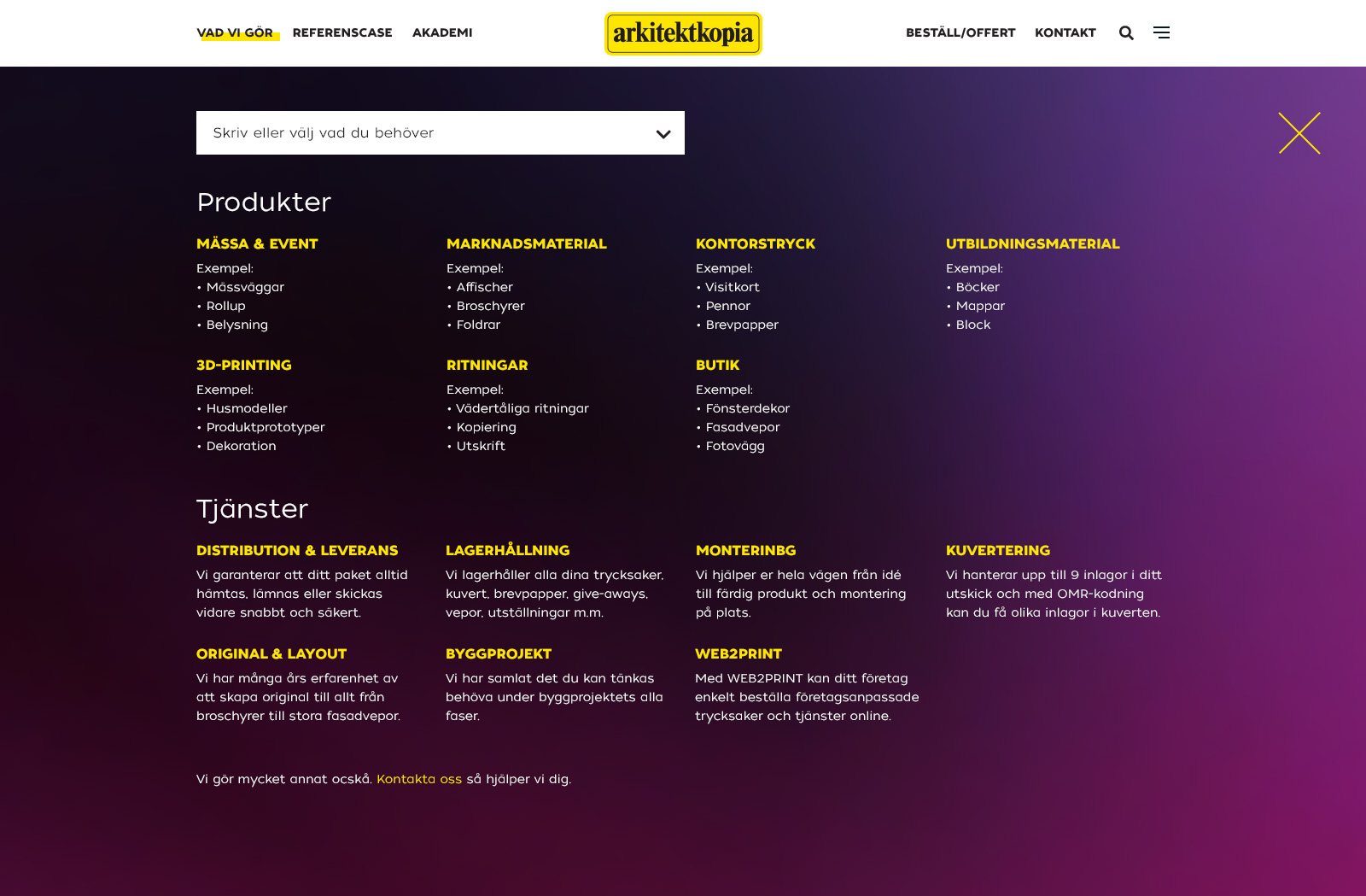 Arkitektkopia ville modernisera sitt varumärke och samtidigt uppdatera webbplatsen arkitektkopia.se. Målet var att göra det enklare att hitta bland deras många produkter samt att få in fler förfrågningar genom formulär. Rent grafiskt ville vi göra något som stack ut på marknaden. Sidan nominerades till Publishingpriset 2018.