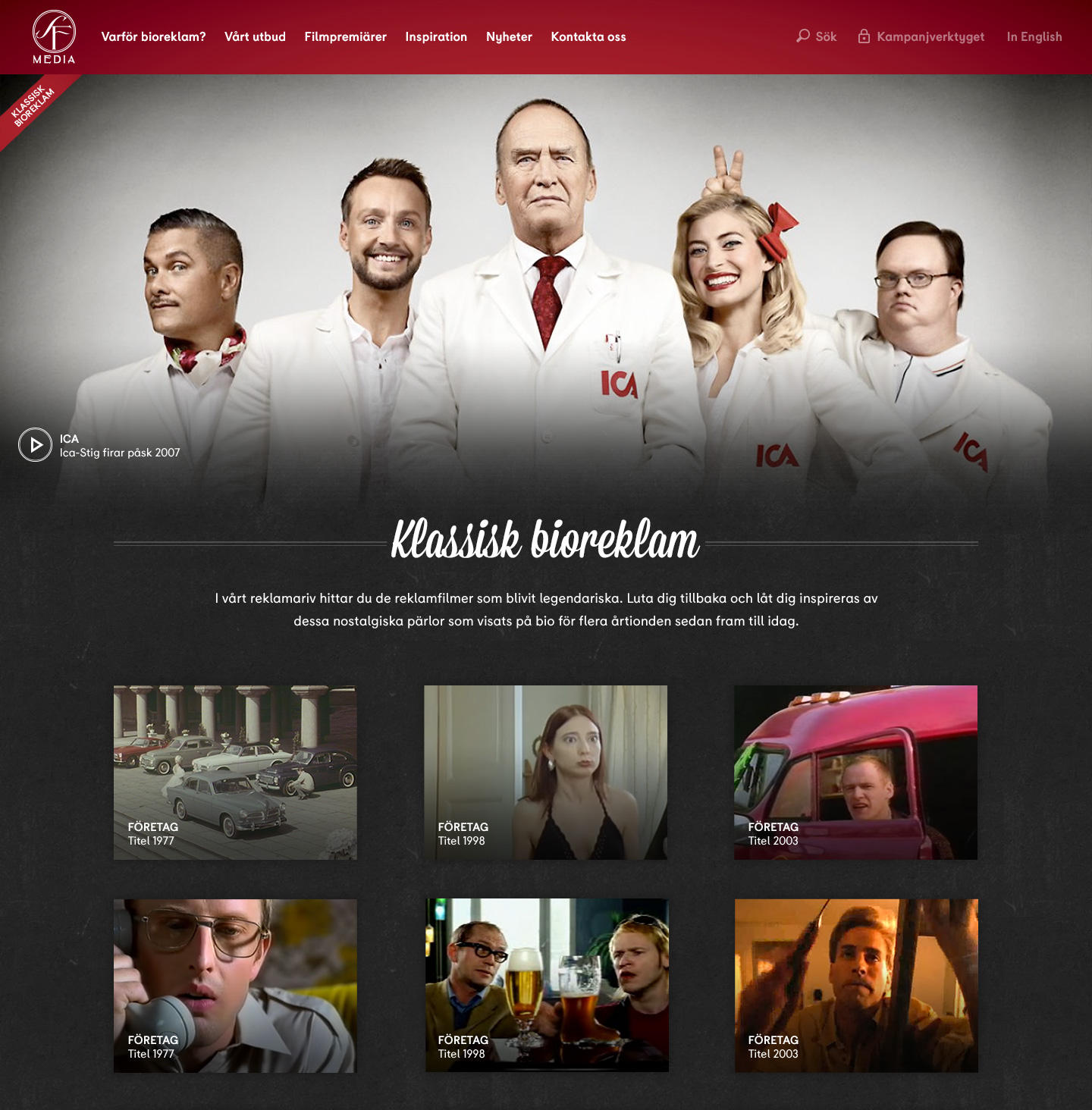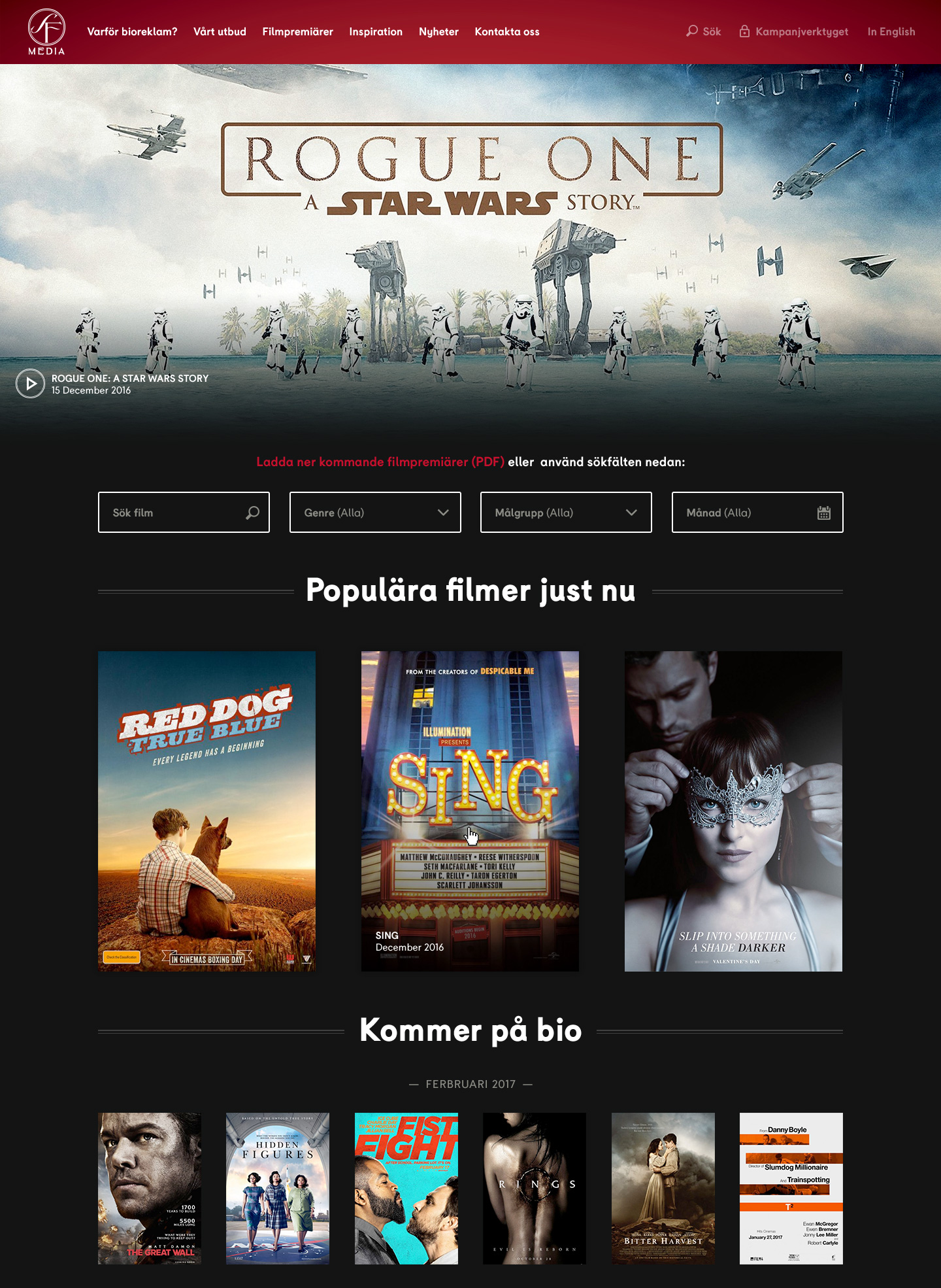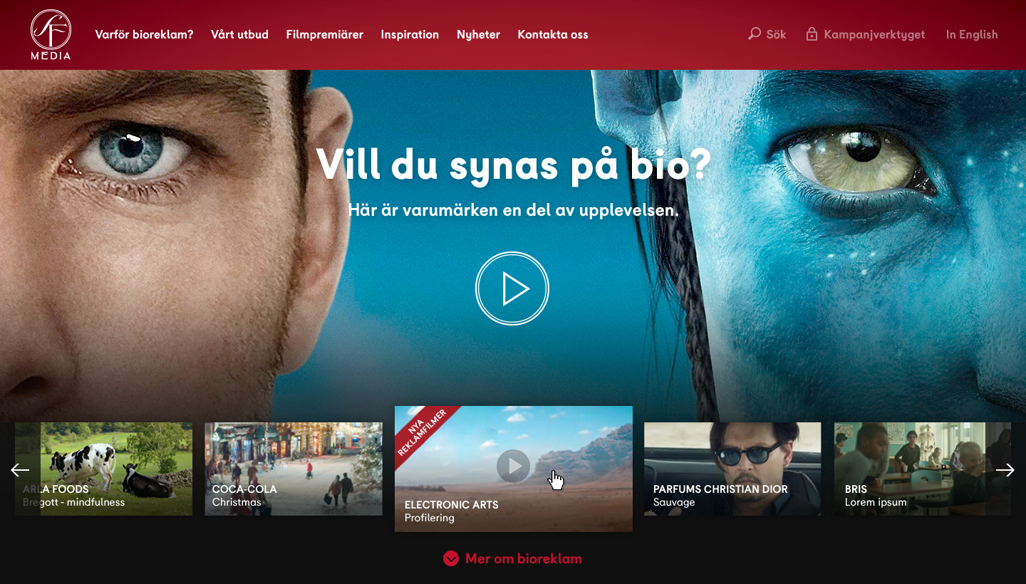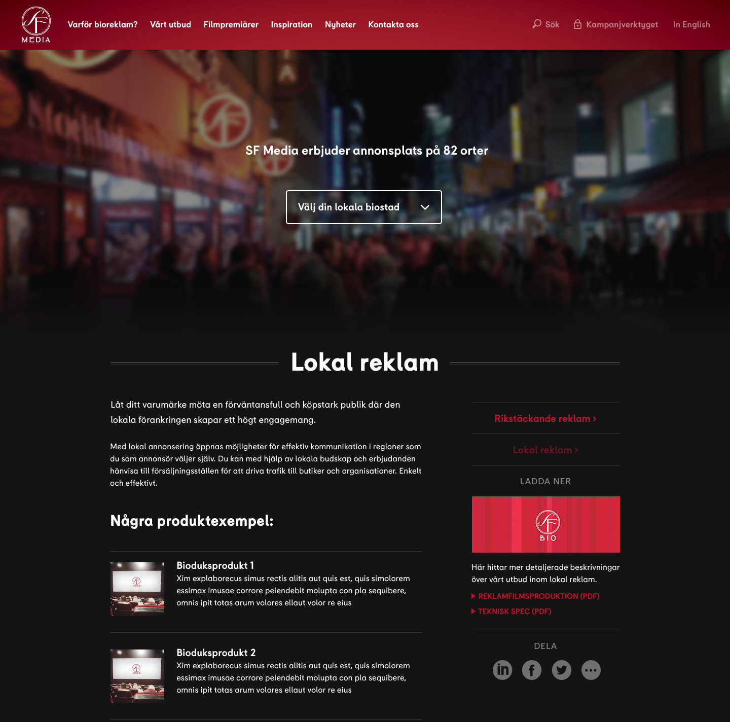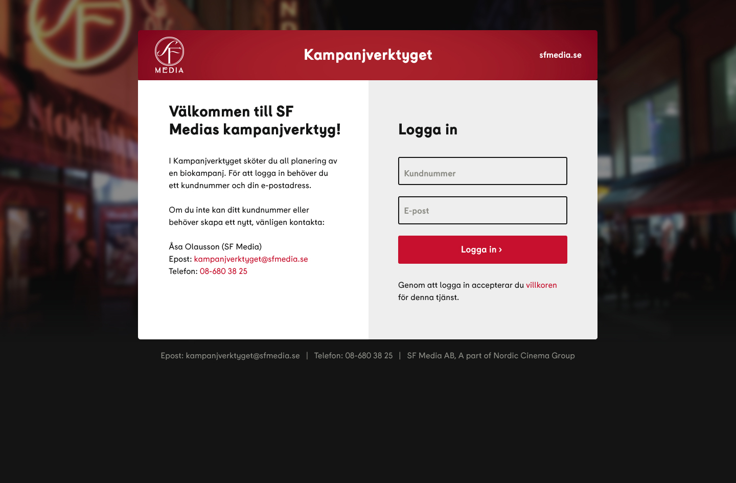 SFmedia.se är SF Bios sajt för försäljning av bioreklam, annonser och event på bio. Målet med designen var dels att lyfta fram budskapet "Varför använda bioreklam?", samt att förtydliga deras utbud. Det grafiska uttrycket ska återspegla SF Bio med mycket "filmkänsla". Gjorde även en uppdaterad design av Kampanjverktyget där användaren kan logga in och boka sin reklamplats.